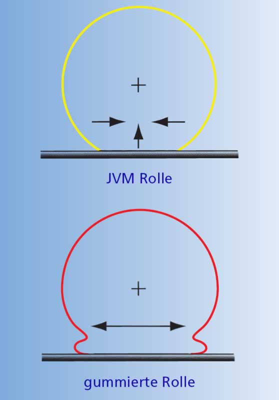 Im Arbeitsprozeß wird die Rolle zusammengepreßt, also Druck auf sie ausgeübt. Im Gegensatz zu JVM Rollen sind gummierte sowie polyurethanbeschichtete Rollen stark plastisch verformbar. Hierdurch kommt es zum Walken der Beschichtung im Arbeitsbereich (Rollenspalt) der Rollen. So verursacht der Anpreßdruck, der über hydraulisch oder pneumatisch geregelte Zylinder angestellt wird, Spannungen in der Oberfläche der Gummierung oder der Polyurethanbeschichtung.
